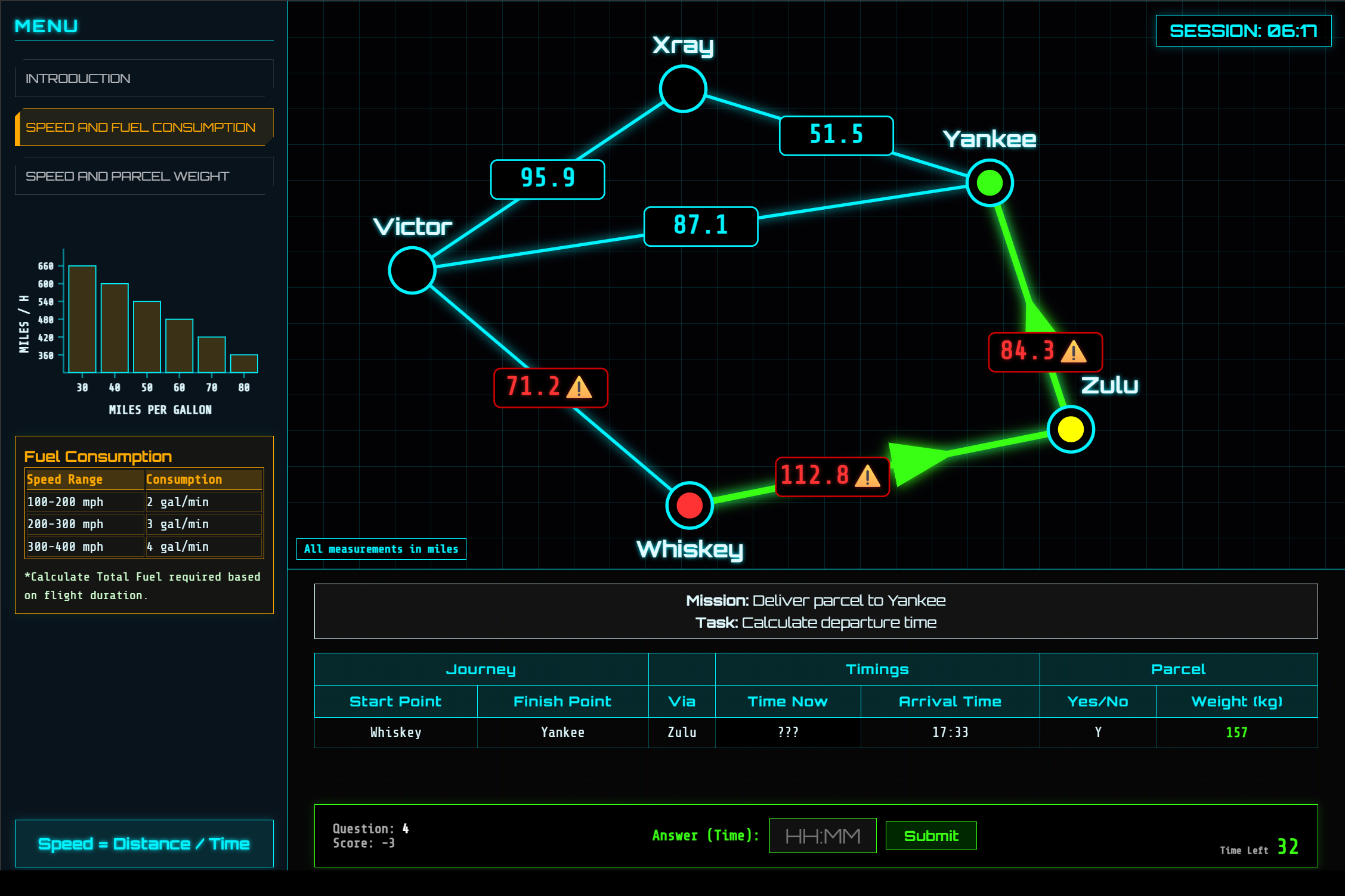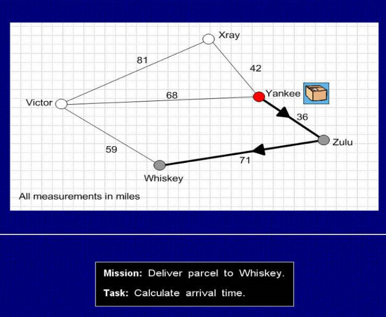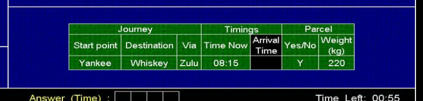 Each question opens with a mission brief describing the task, for example finding the arrival time for a route across three named checkpoints. Read this first. It tells you what you are solving for, which determines which values you need and in what order to use them.