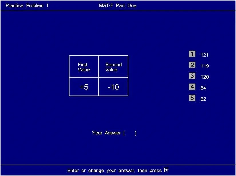 When the screen displays a First Value and a Second Value, you must locate the intersection of those two coordinates on the physical grid and identify the number held there. When you have identified that number, you match it to the correct option from the five multiple-choice answers displayed on the right side of the screen, numbered 1 through 5, and enter that digit on the keyboard. You then press the advance key to confirm and move to the next question.
