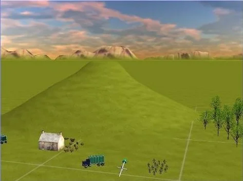 Tab one appears: the farm sits two grid squares left of centre. Tab two: the truck sits three squares left and one below centre. You infer: these two objects occupy distinct grid zones and do not overlap. By tab four you have logged trees to the right mid-section and troops at bottom-centre. Tabs five and six then show the red and yellow aircraft entering from the lower-left, accelerating as its flight path dots tighten near the mountain grid position, then slowing on exit, confirmed by the altitude chart's rising-then-spreading dot pattern. Tabs seven and eight repeat this reading for the helicopter. The 3D scene then plays. The question reads: "Is the truck accurate?" You check only the truck's type and grid position against what tab two showed. The answer is independent of whether the aircraft or helicopter paths render correctly.